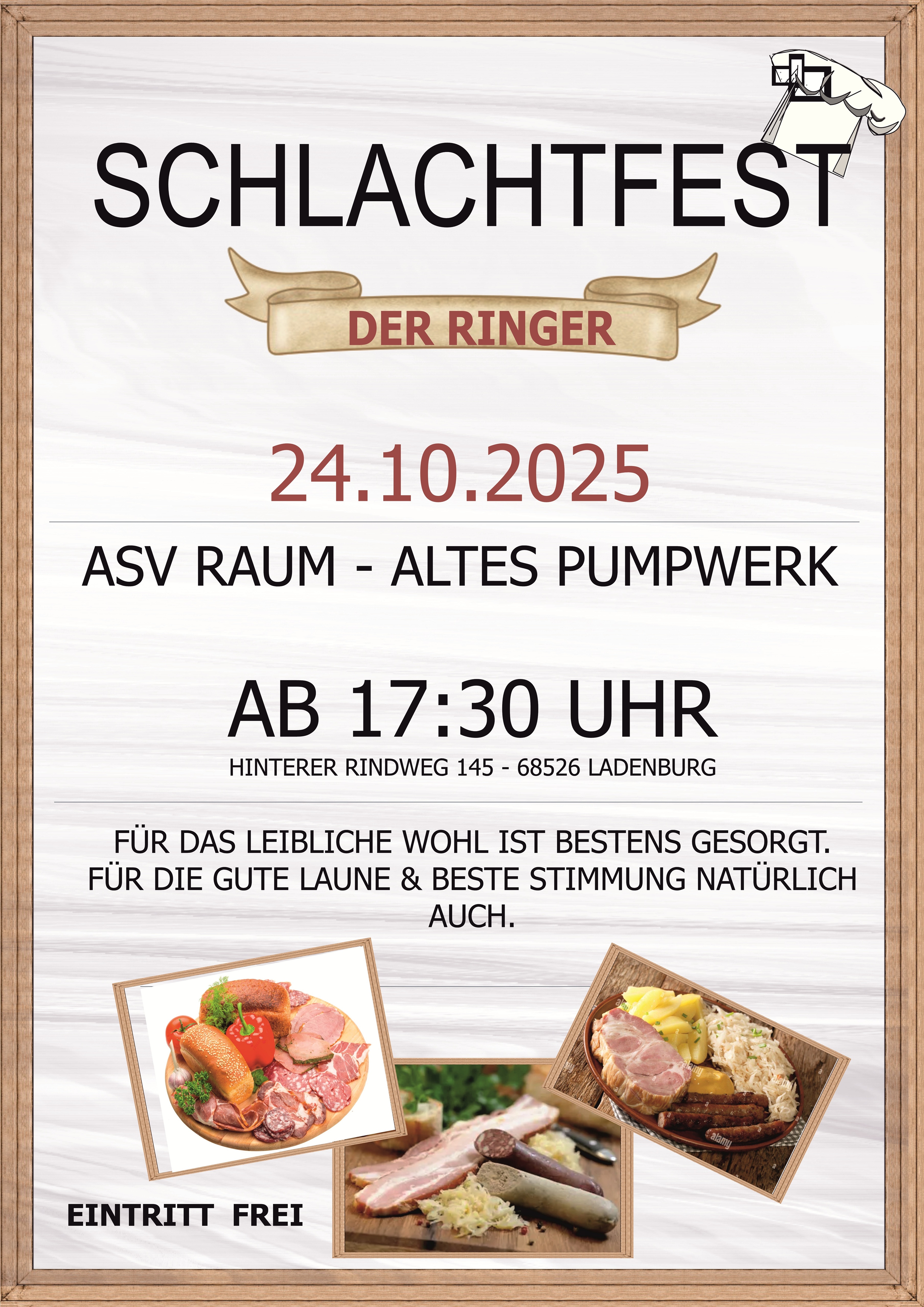 Am Freitag, den 25. Oktober, findet ab 17.30 Uhr das Schlachtfest der Ringer statt. Wurstsuppe, Wellfleisch, Leberknödel und vieles mehr wird zum Verzehr angeboten. Die Veranstaltung findet auf dem ASV-Gelände Hinterer Rindweg statt.
